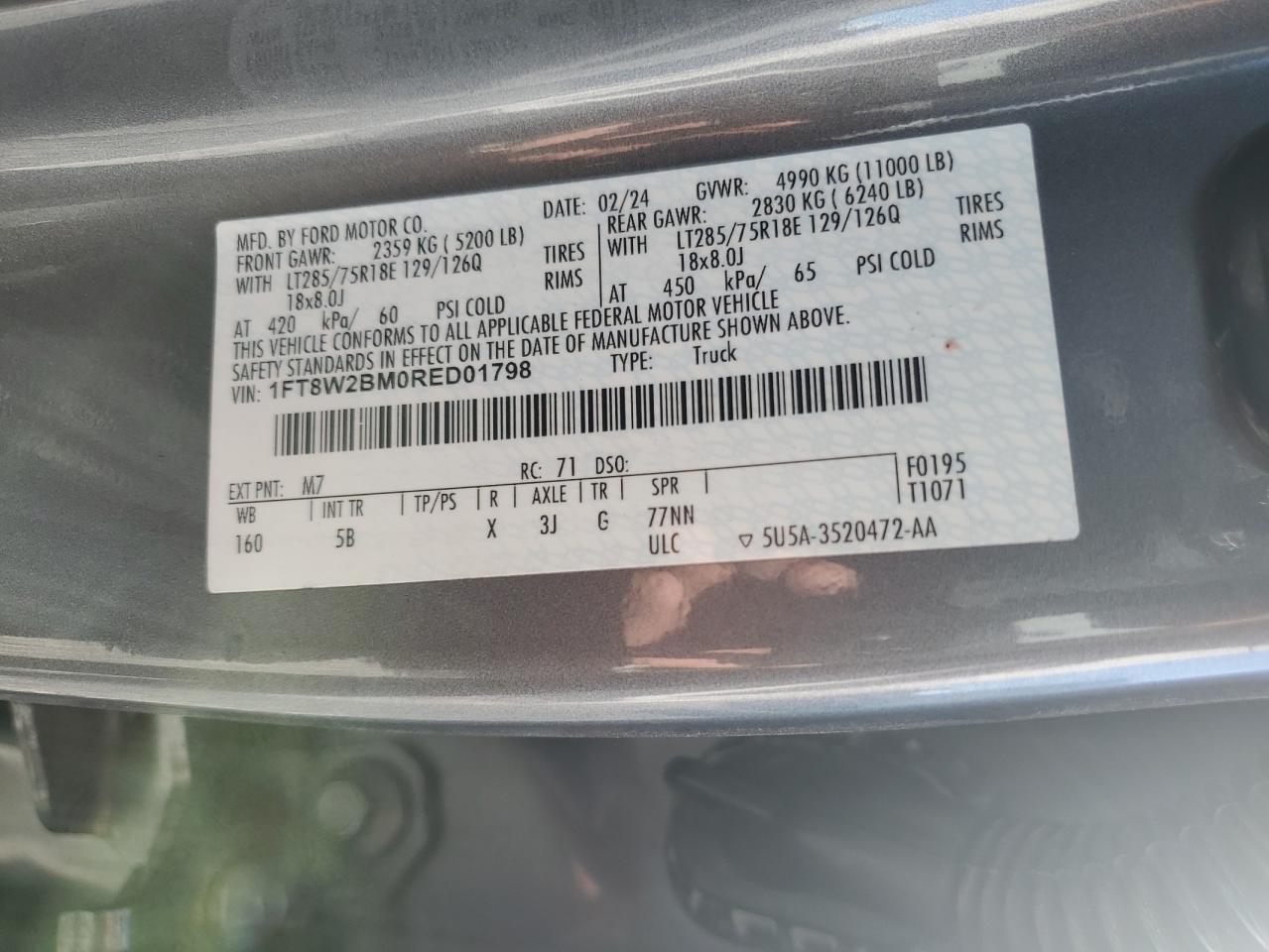 Колір Деревне вугілляЦиліндри 8Привід 4x4 з заднім приводомVIN 1FT8W2BM0RED01798Стан Заводиться та їде (перевірено)Ушкодження Передня або задня
