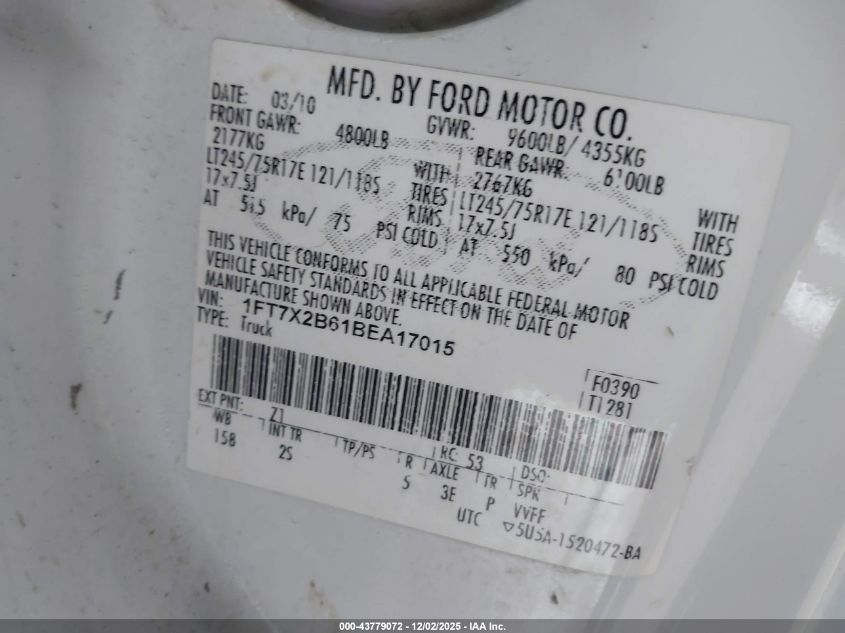 Колір БілийЦиліндри 8Привід Повний привідVIN 1FT7X2B61BEA17015Стан СтаціонарноУшкодження Передня або задняДата аукціону 2025-12-11