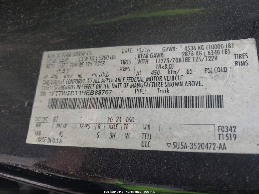 Колір ЧорнийЦиліндри 8Привід Повний привідVIN 1FT7W2BT1HEB88767Стан СтаціонарноУшкодження Пожежа AutoRIA