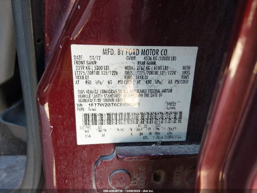 Колір ЧервонийЦиліндри 8Привід Повний привідVIN 1FT7W2BT6CEB96100Стан СтаціонарноУшкодження З боків