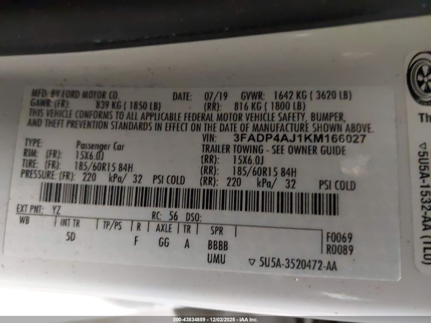 Колір БілийЦиліндри 4Привід Передній привідVIN 3FADP4AJ1KM166027Стан СтаціонарноУшкодження Передня або задня AutoRIA