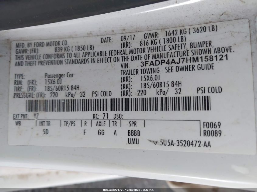 Колір БілийЦиліндри 4Привід Передній привідVIN 3FADP4AJ7HM158121Стан Заводиться та їде (перевірено)Ушкодження З боківДата аукціону 2025-12-09 AutoRIA