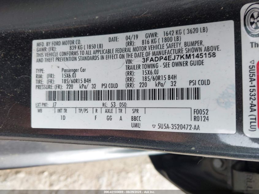 2019 FORD FIESTA 2019 року Бензин, 1.6, Передній привід, vin - 3FADP4EJ7KM145158 з США