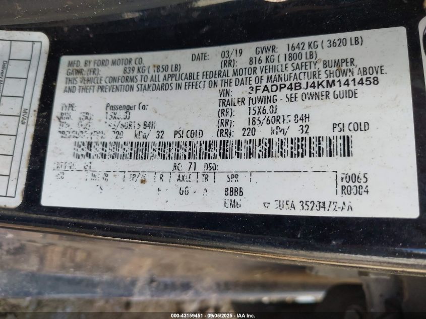 Колір ЧорнийЦиліндри 4Привід Передній привідVIN 3FADP4BJ4KM141458Стан СтаціонарноУшкодження По всьому авто AutoRIA