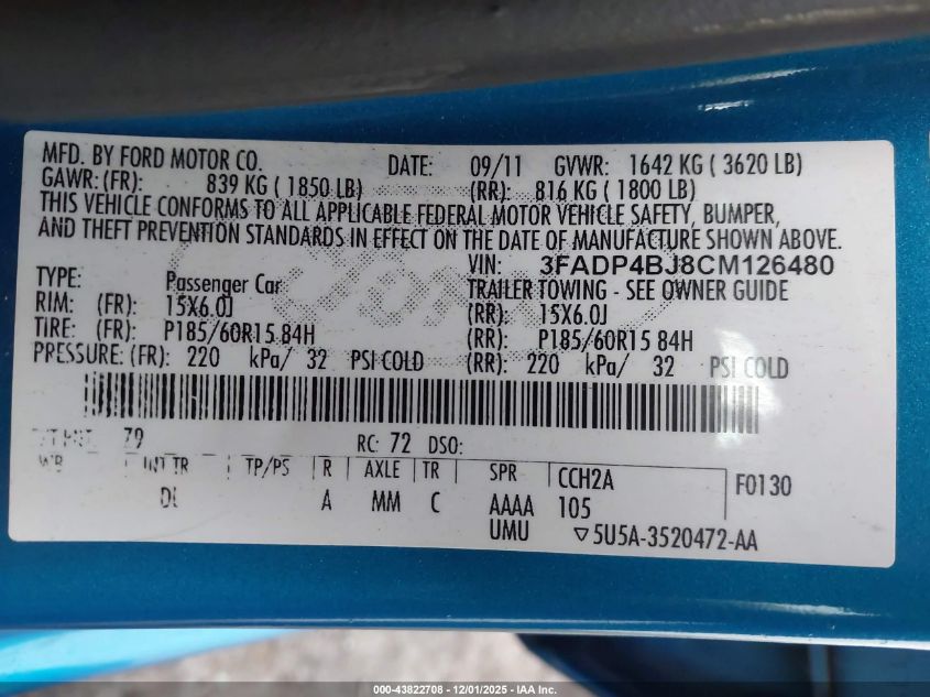 Колір СинійЦиліндри 4Привід Передній привідVIN 3FADP4BJ8CM126480Стан Заводиться та їде (перевірено)Ушкодження ЗадняДата аукціону 2025-12-18 AutoRIA