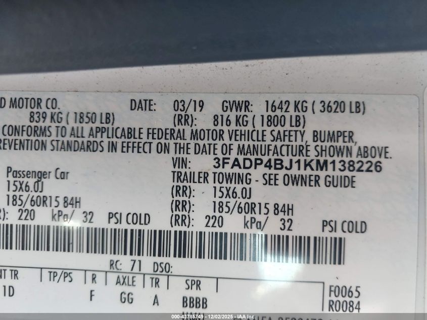 Колір БілийЦиліндри 4Привід Передній привідVIN 3FADP4BJ1KM138226Стан СтаціонарноУшкодження Передня або задня AutoRIA