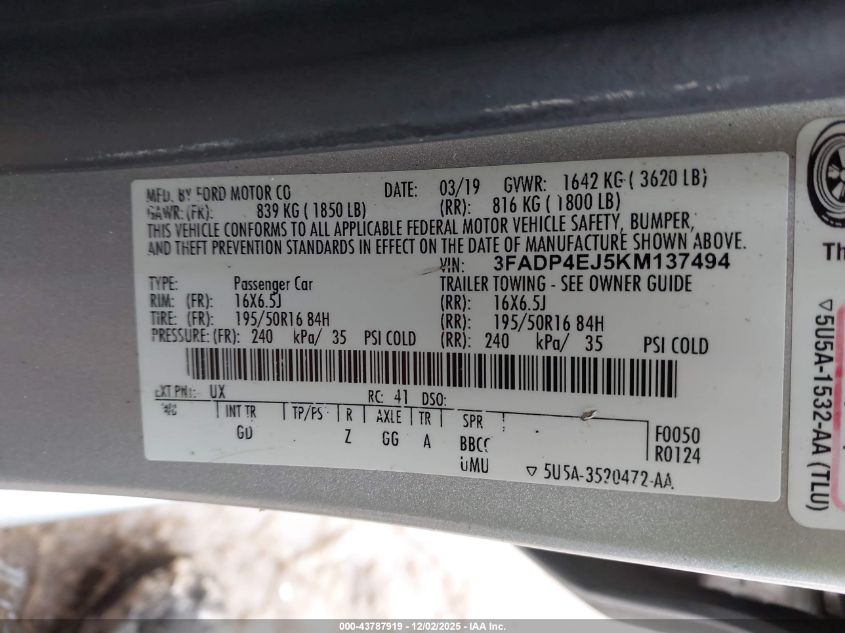 Колір СрібнийЦиліндри 4Привід Передній привідVIN 3FADP4EJ5KM137494Стан СтаціонарноУшкодження Передня або задня AutoRIA
