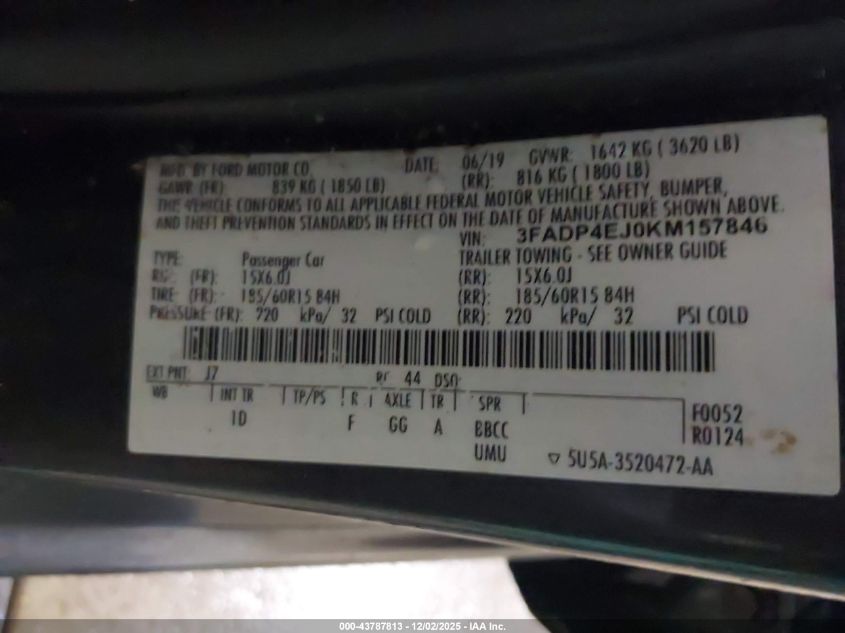 2019 FORD FIESTA 2019 року Бензин, 1.6, Передній привід, vin - 3FADP4EJ0KM157846 з США