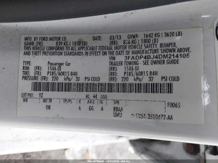 Колір БілийЦиліндри 4Привід Передній привідVIN 3FADP4BJ4DM214105Стан СтаціонарноУшкодження Передня або задня AutoRIA