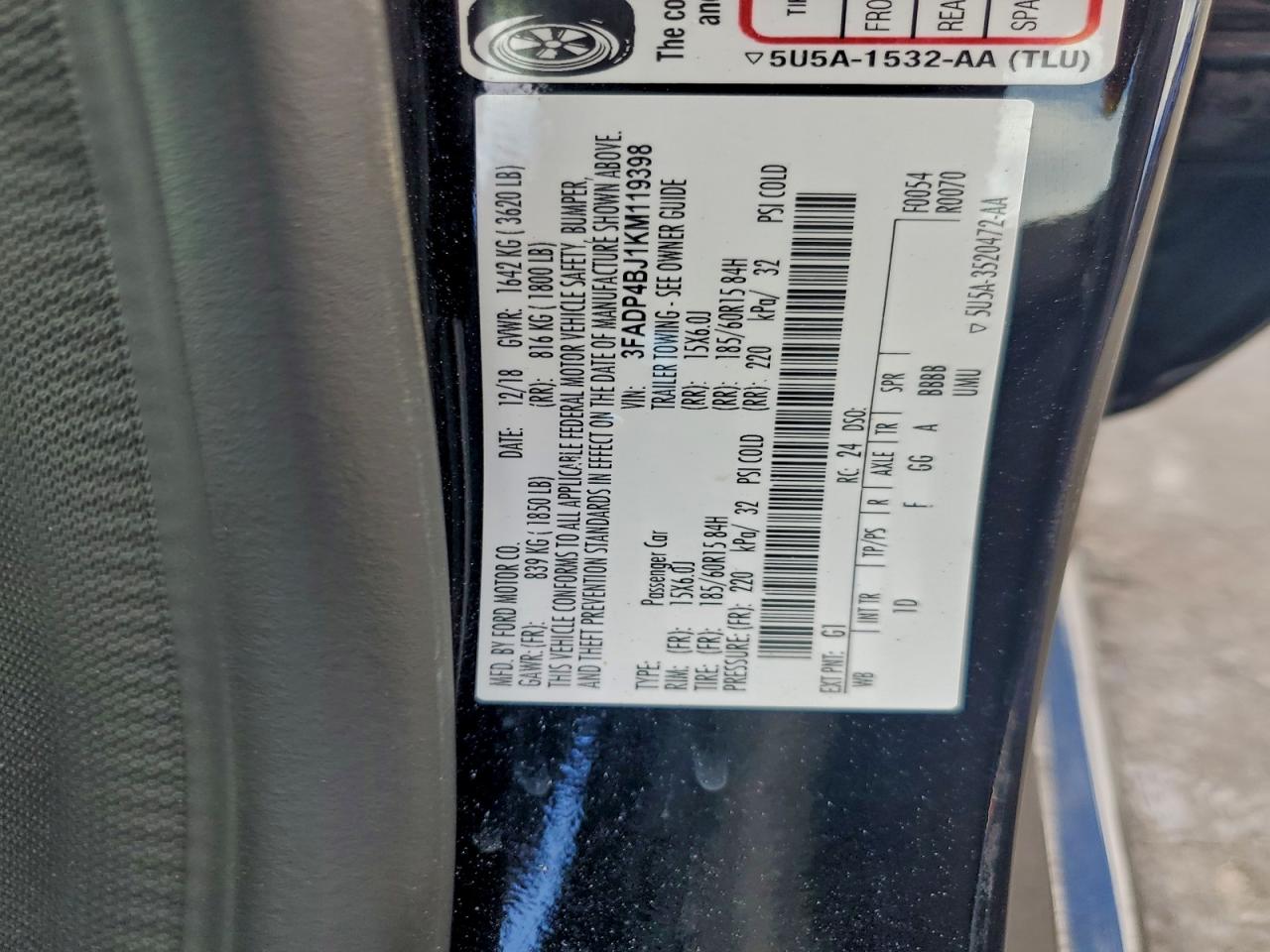 Колір ЧорнийЦиліндри 4VIN 3FADP4BJ1KM119398Стан Заводиться та їде (перевірено)Ушкодження Передня або задняДата аукціону 2025-12-10 AutoRIA