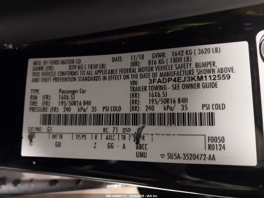 Колір ЧорнийЦиліндри 4Привід Передній привідVIN 3FADP4EJ3KM112559Стан СтаціонарноУшкодження Передня або задня AutoRIA