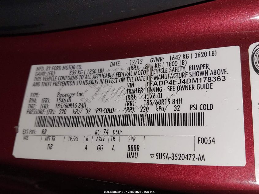 2013 FORD FIESTA 2013 року Бензин, 1.6, Передній привід, vin - 3FADP4EJ4DM178363 з США