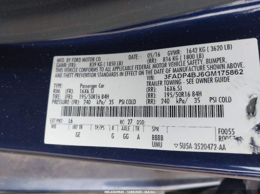 Колір СинійЦиліндри 4Привід Передній привідVIN 3FADP4BJ6GM175862Стан Заводиться та їде (перевірено)Ушкодження Ліва сторона AutoRIA