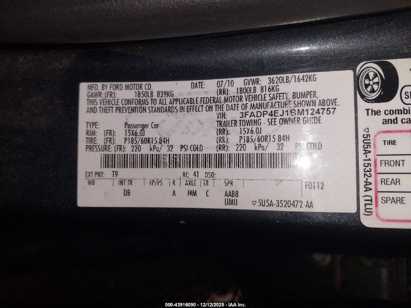 2011 FORD FIESTA 2011 року Бензин, 1.6, Передній привід, vin - 3FADP4EJ1BM124757 з США