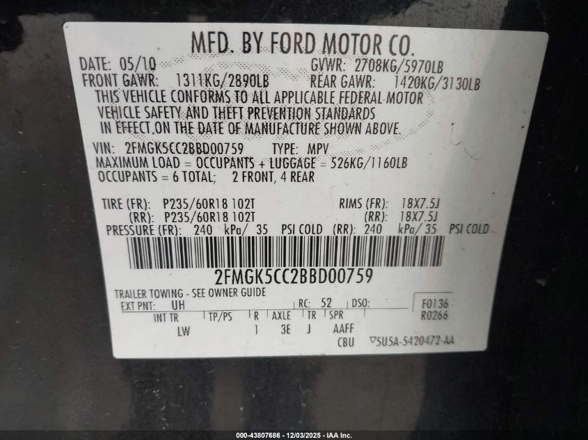 Колір ЧорнийЦиліндри 6Привід Передній привідVIN 2FMGK5CC2BBD00759Стан Заводиться та їде (перевірено)Ушкодження З боків