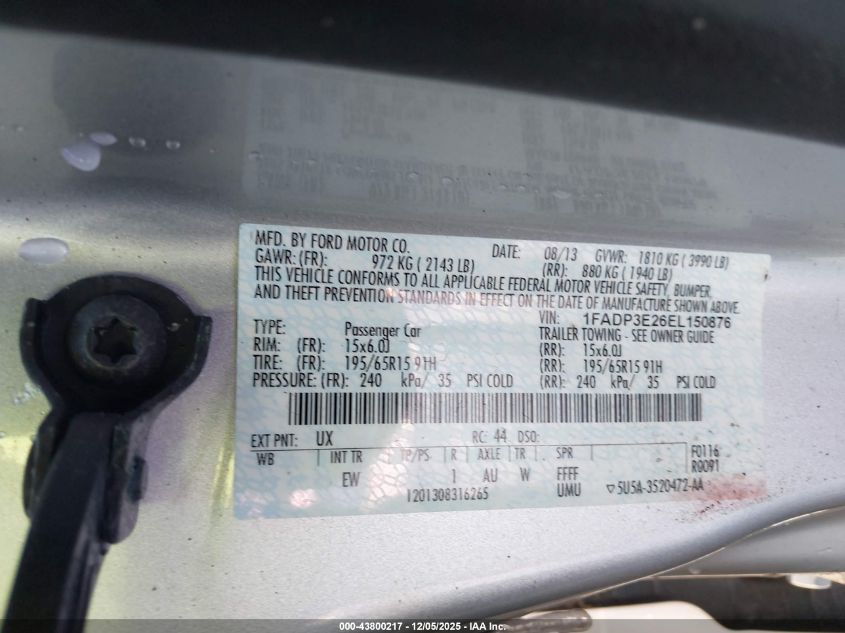 Колір СрібнийЦиліндри 4Привід Передній привідVIN 1FADP3E26EL150876Стан Заводиться та їде (перевірено)Ушкодження Передня або задня AutoRIA