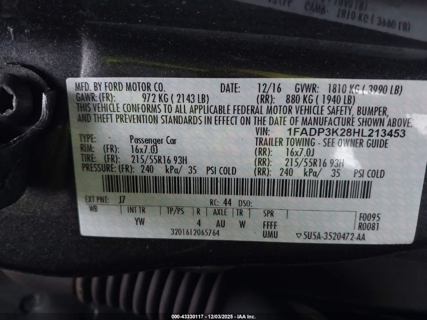 Колір СірийЦиліндри 4Привід Передній привідVIN 1FADP3K28HL213453Стан СтаціонарноУшкодження Передня або задняДата аукціону 2025-12-10 AutoRIA