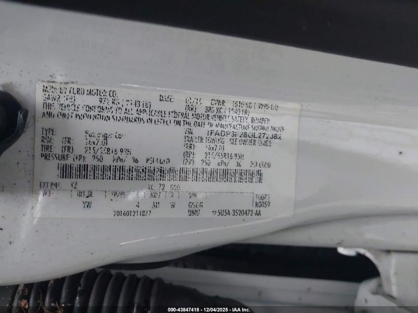 Колір БілийЦиліндри 4Привід Передній привідVIN 1FADP3F28GL272382Стан Заводиться та їде (перевірено)Ушкодження Ліва сторона AutoRIA