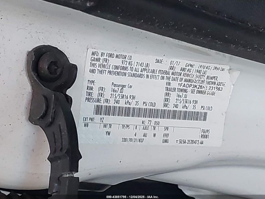 Колір БілийЦиліндри 4Привід Передній привідVIN 1FADP3K26HL231563Стан Заводиться та їде (перевірено)Ушкодження Передня або задня AutoRIA