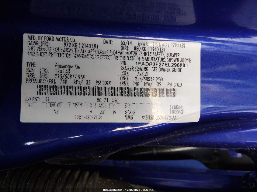 Колір ФіолетовийЦиліндри 4Привід Передній привідVIN 1FADP3F27EL296881Стан Заводиться та їде (перевірено)Ушкодження Задня AutoRIA