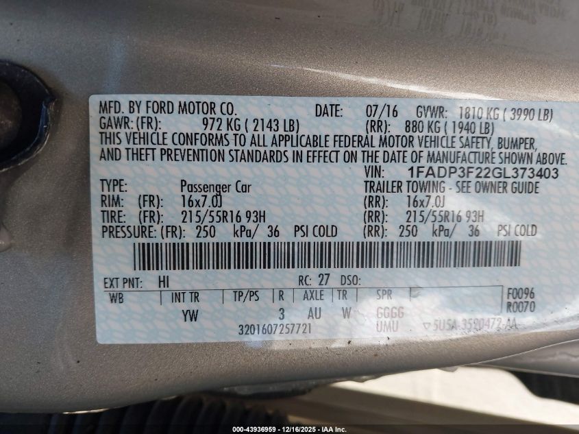 2016 FORD FOCUS 2016 року Бензин, 2.0, Передній привід, vin - 1FADP3F22GL373403 з США