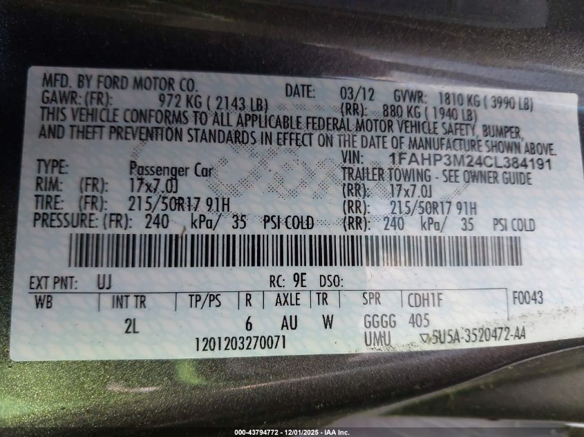 2012 FORD FOCUS 2012 року Бензин, 2.0, Передній привід, vin - 1FAHP3M24CL384191 з США