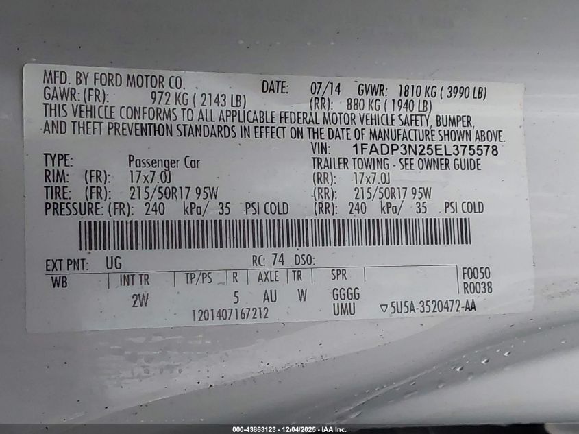 Колір БілийЦиліндри 4Привід Передній привідVIN 1FADP3N25EL375578Стан Заводиться та їде (перевірено)Ушкодження Задня AutoRIA
