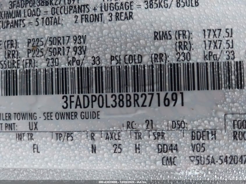 Колір СрібнийЦиліндри 4Привід Передній привідVIN 3FADP0L38BR271691Стан ЗаводитьсяУшкодження Ліва сторона