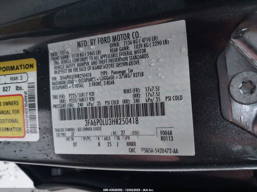 2017 FORD FUSION HYBRID 2017 року Гібрид, 2.0, Передній привід, vin - 3FA6P0LU3HR250418 з США