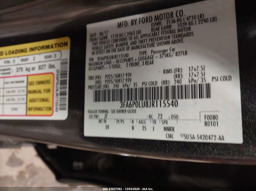 Колір СірийЦиліндри 4Привід Передній привідVIN 3FA6P0LU8JR115540Стан Заводиться та їде (перевірено)Ушкодження Передня або задняДата аукціону 2025-12-08 AutoRIA