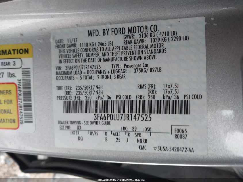 2018 FORD FUSION HYBRID 2018 року Гібрид, 2.0, Передній привід, vin - 3FA6P0LU7JR147525 з США