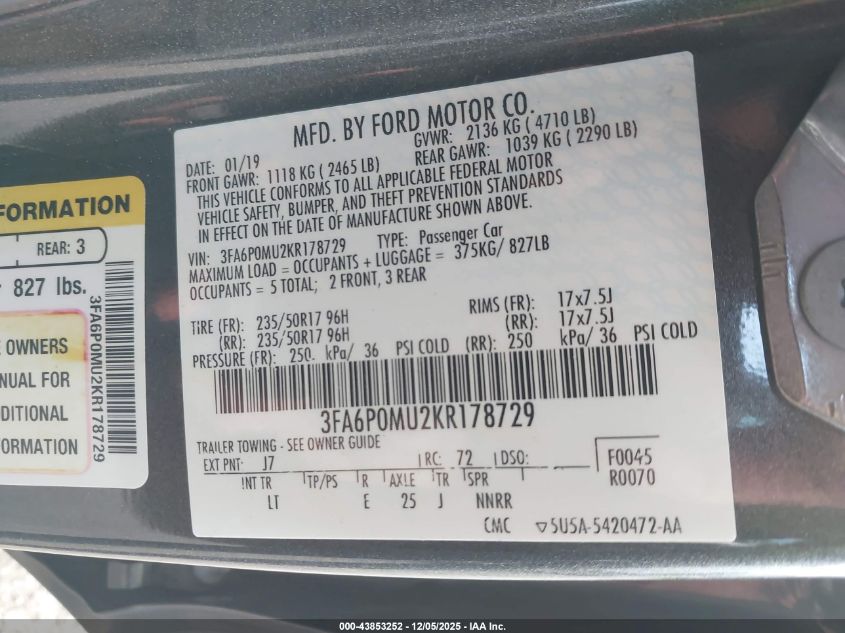 2019 FORD FUSION HYBRID 2019 року Гібрид, 2.0, Передній привід, vin - 3FA6P0MU2KR178729 з США