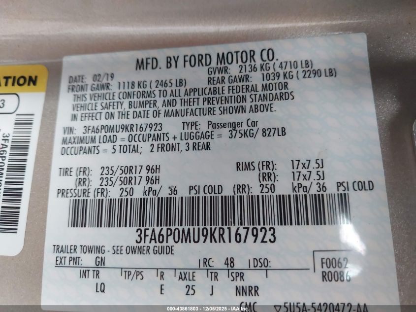 2019 FORD FUSION HYBRID 2019 року Гібрид, 2.0, Передній привід, vin - 3FA6P0MU9KR167923 з США