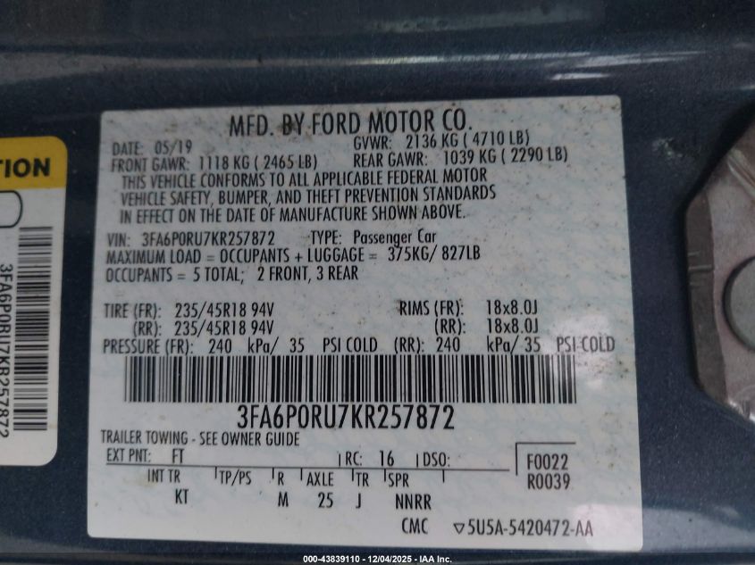 2019 FORD FUSION HYBRID 2019 року Гібрид, 2.0, Передній привід, vin - 3FA6P0RU7KR257872 з США