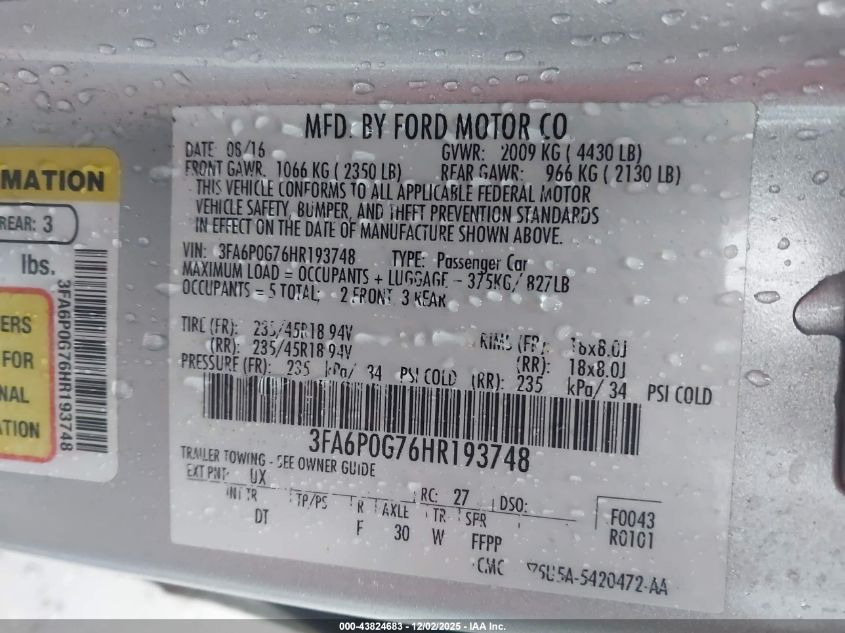 2017 FORD FUSION 2017 року Бензин, 2.5, Передній привід, vin - 3FA6P0G76HR193748 з США