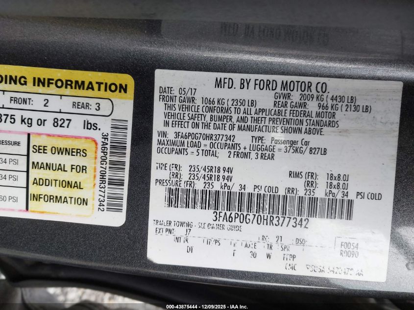 2017 FORD FUSION 2017 року Бензин, 2.5, Передній привід, vin - 3FA6P0G70HR377342 з США