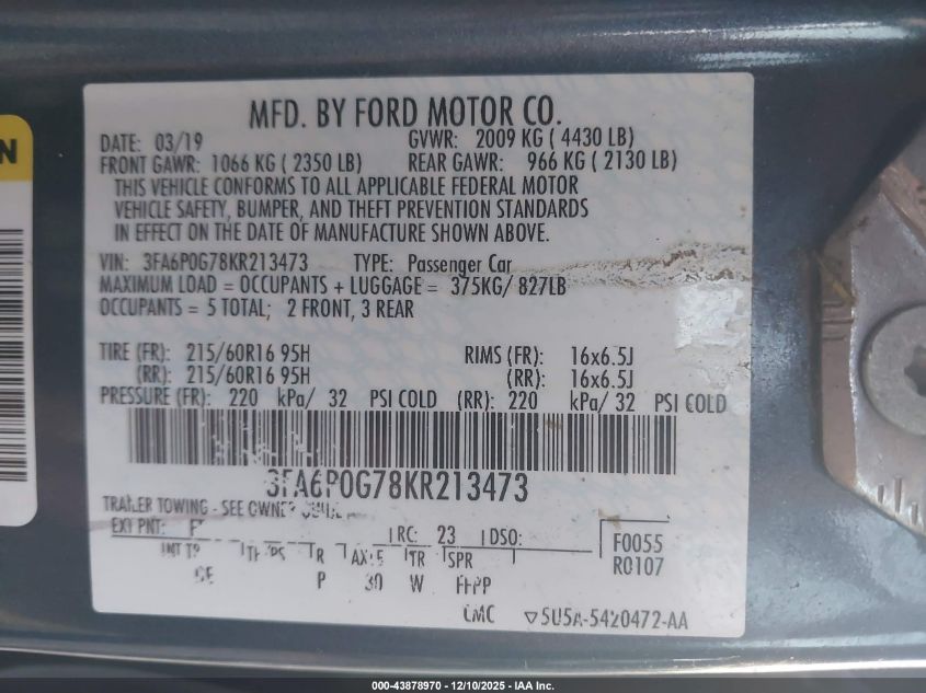 2019 FORD FUSION 2019 року Бензин, 2.5, Передній привід, vin - 3FA6P0G78KR213473 з США