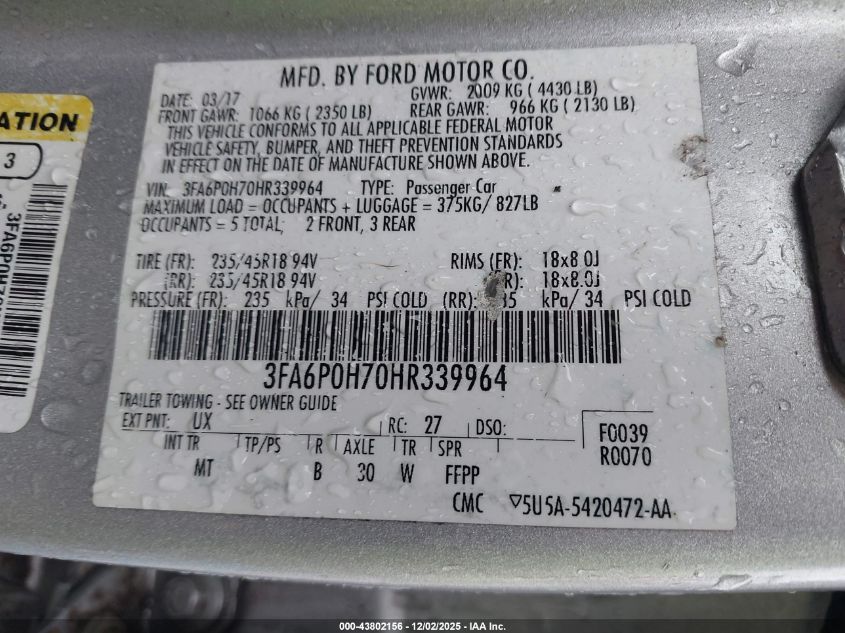 2017 FORD FUSION 2017 року Бензин, 2.5, Передній привід, vin - 3FA6P0H70HR339964 з США