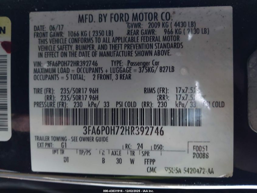 2017 FORD FUSION 2017 року Бензин, 2.5, Передній привід, vin - 3FA6P0H72HR392746 з США