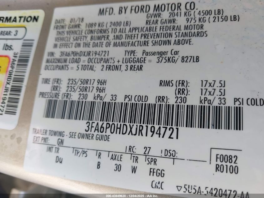 Колір ЗолотийЦиліндри 4Привід Передній привідVIN 3FA6P0HDXJR194721Стан СтаціонарноУшкодження Пожежа двигуна AutoRIA