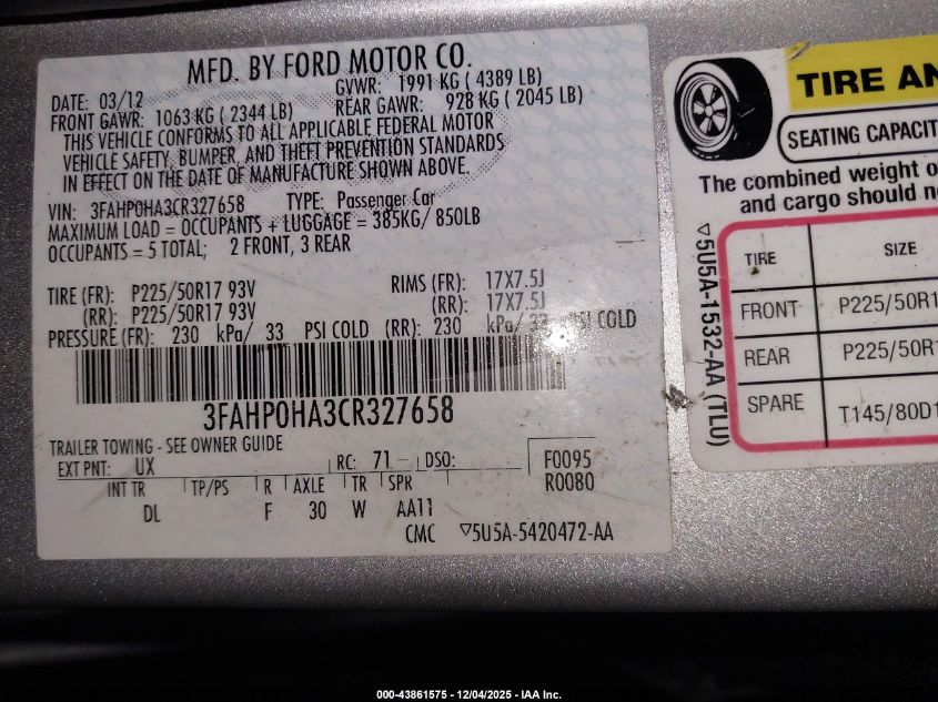 2012 FORD FUSION 2012 року Бензин, 2.5, Передній привід, vin - 3FAHP0HA3CR327658 з США