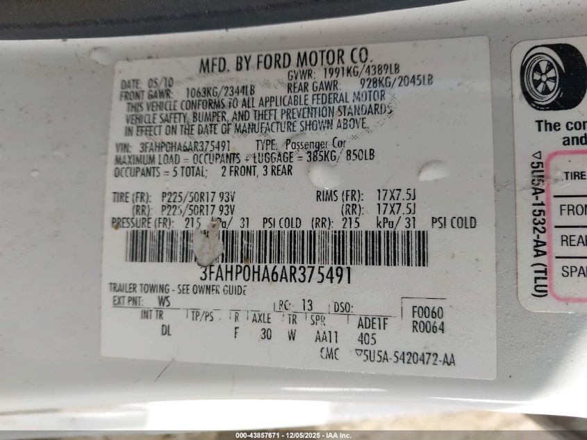 2010 FORD FUSION 2010 року Бензин, 2.5, Передній привід, vin - 3FAHP0HA6AR375491 з США