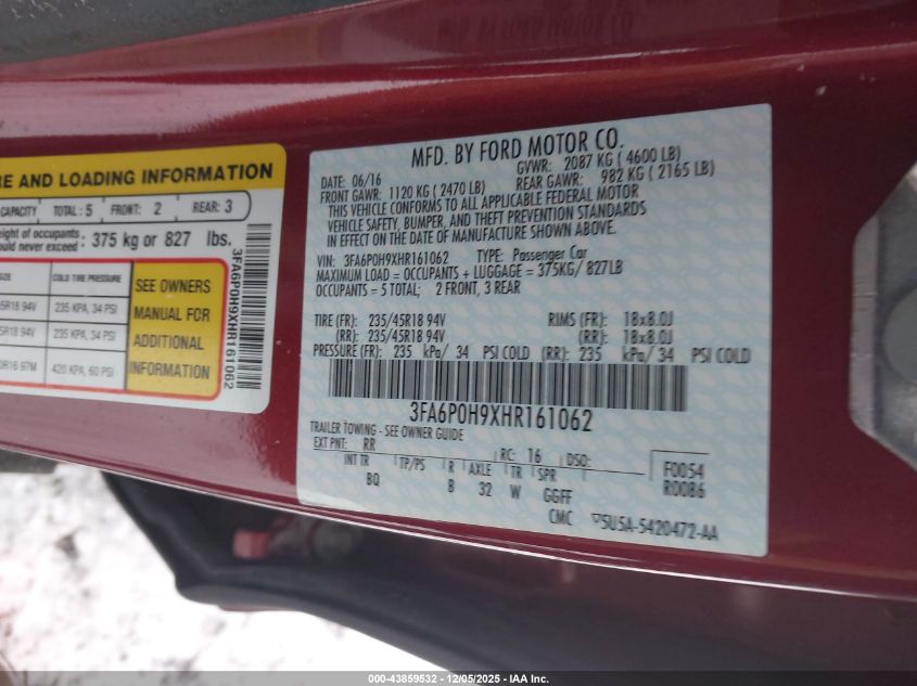 2017 FORD FUSION 2017 року Бензин, 2.0, Передній привід, vin - 3FA6P0H9XHR161062 з США