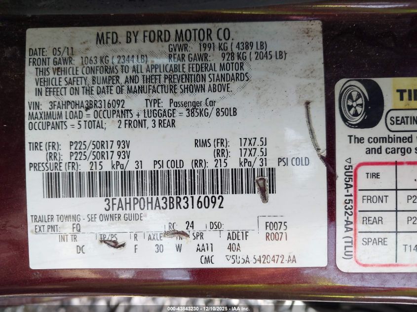 2011 FORD FUSION 2011 року Бензин, 2.5, Передній привід, vin - 3FAHP0HA3BR316092 з США