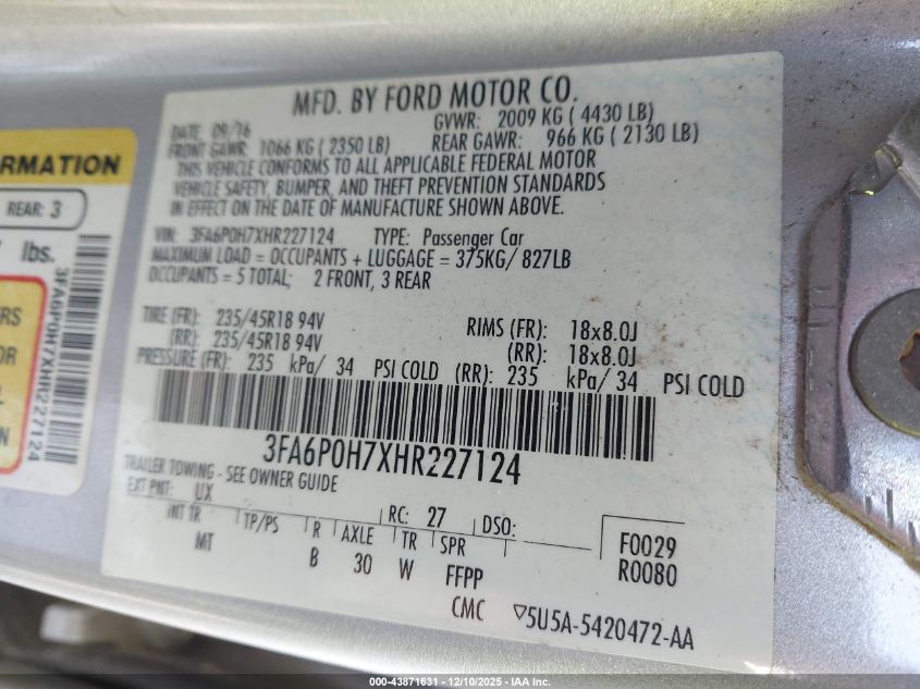 2017 FORD FUSION 2017 року Бензин, 2.5, Передній привід, vin - 3FA6P0H7XHR227124 з США