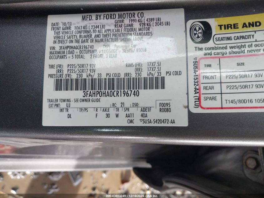 Колір СірийЦиліндри 4Привід Передній привідVIN 3FAHP0HA0CR196740Стан Заводиться та їде (перевірено)Ушкодження Права сторона AutoRIA