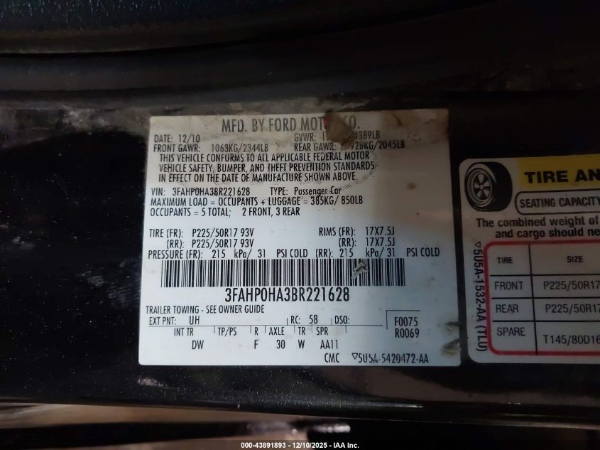 Колір ЧорнийЦиліндри 4Привід Передній привідVIN 3FAHP0HA3BR221628Стан Заводиться та їде (перевірено)Ушкодження Передня права AutoRIA