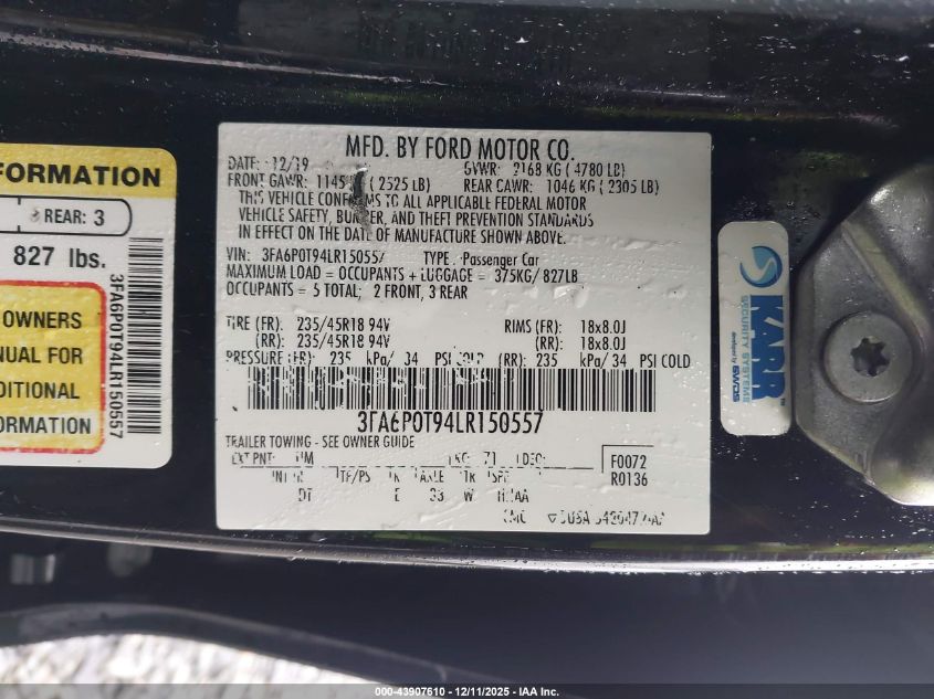 2020 FORD FUSION 2020 року Бензин, 2.0, Повний привід, vin - 3FA6P0T94LR150557 з США