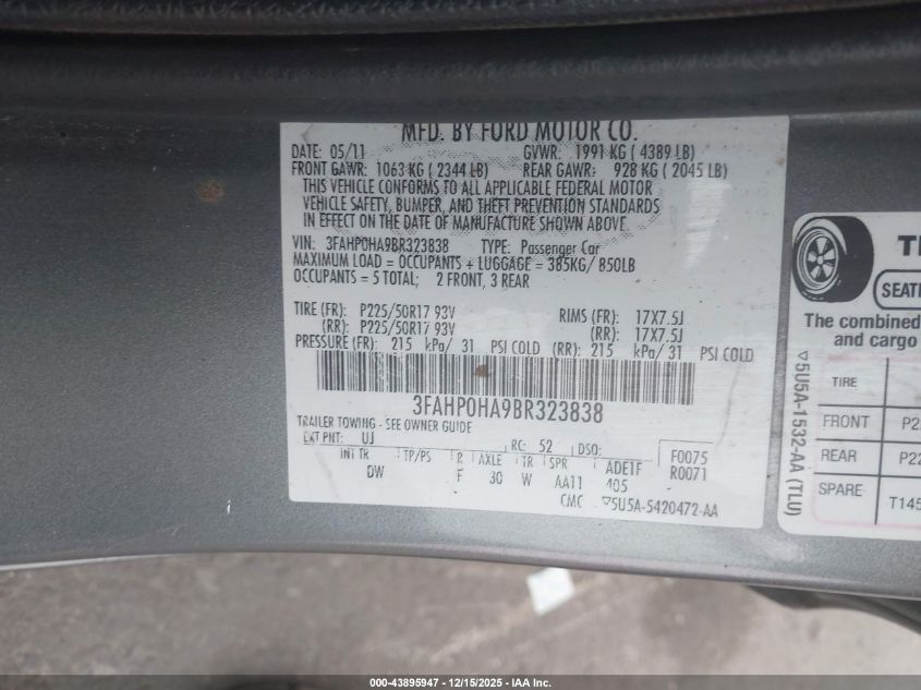 2011 FORD FUSION 2011 року Бензин, 2.5, Передній привід, vin - 3FAHP0HA9BR323838 з США