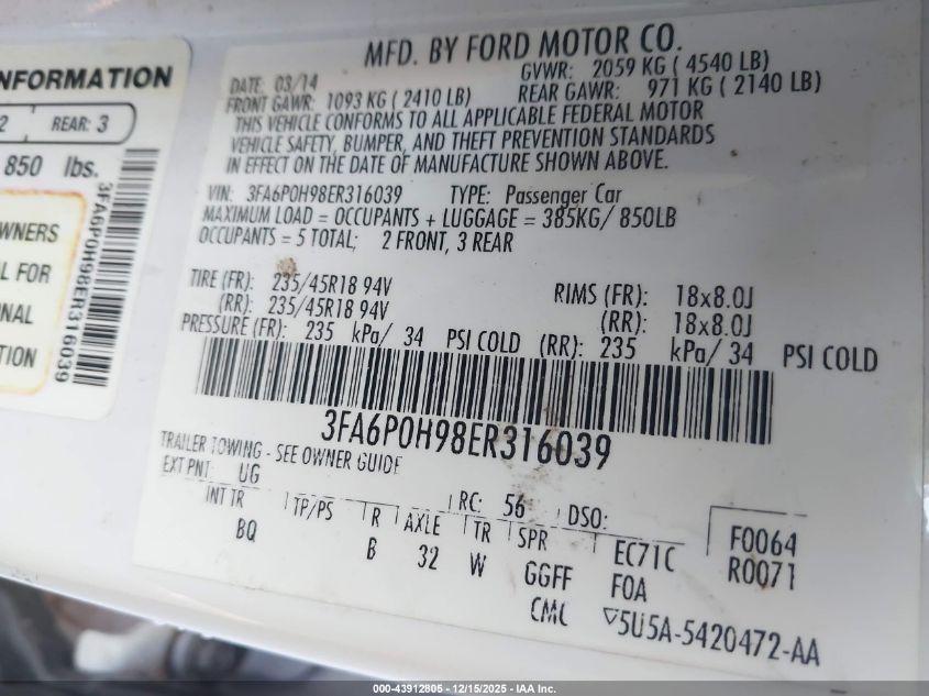 Колір БілийЦиліндри 4Привід Передній привідVIN 3FA6P0H98ER316039Стан Заводиться та їде (перевірено)Ушкодження Передня або задня AutoRIA